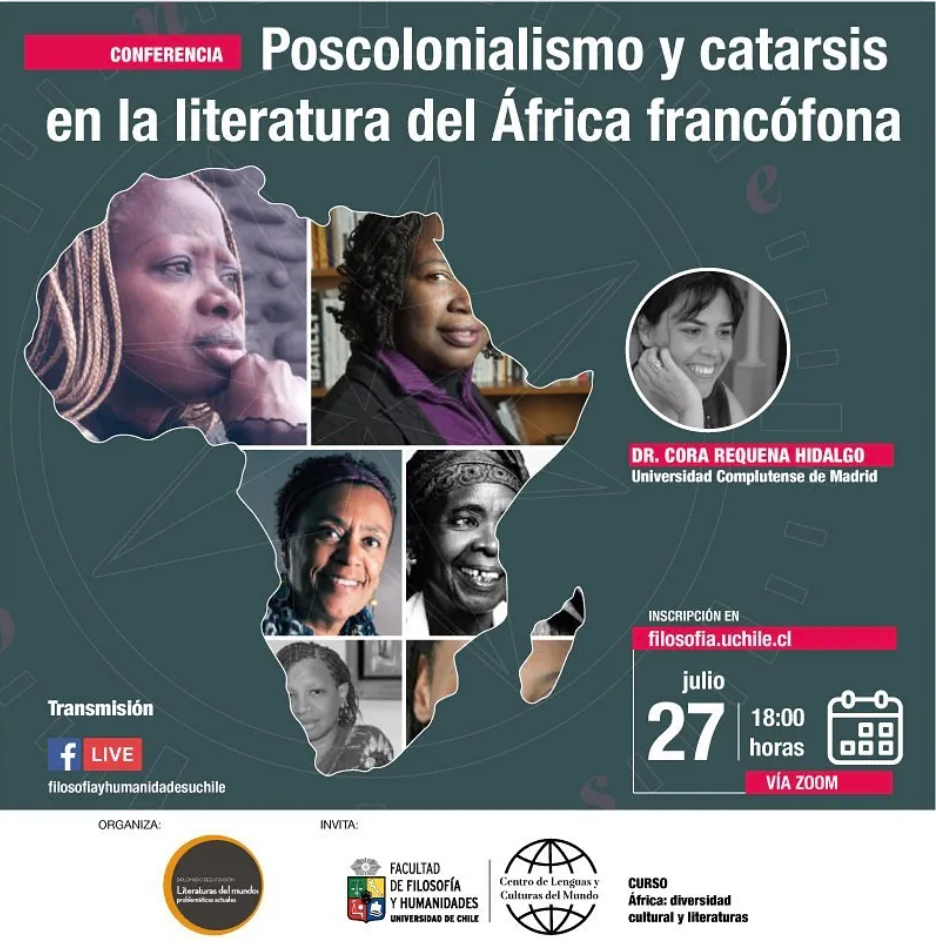 El Diploma de Extensión en Literaturas del Mundo y el curso «África: diversidad cultural y literaturas» del Centro de Lenguas y Culturas del Mundo de la Universidad de Chile invitan a la conferencia «Poscolonialismo y catarsis en la literatura del África francófona» a cargo de la Dra. Cora Requena Hidalgo, académica de la Universidad Complutense de Madrid.